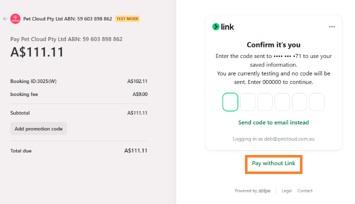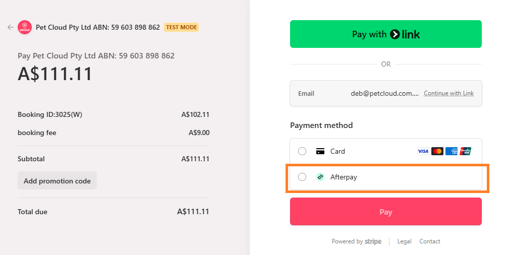 Afterpay is our chosen Buy Now Pay Later solution that lets you pay once off bookings such as house sitting or pet boarding in 4 installments which is accessed in the Stripe Checkout by selecting "Pay without link". Afterpay does not allow this solution for recurring repeat weekly bookings such as dog walking, day care, and home visits.