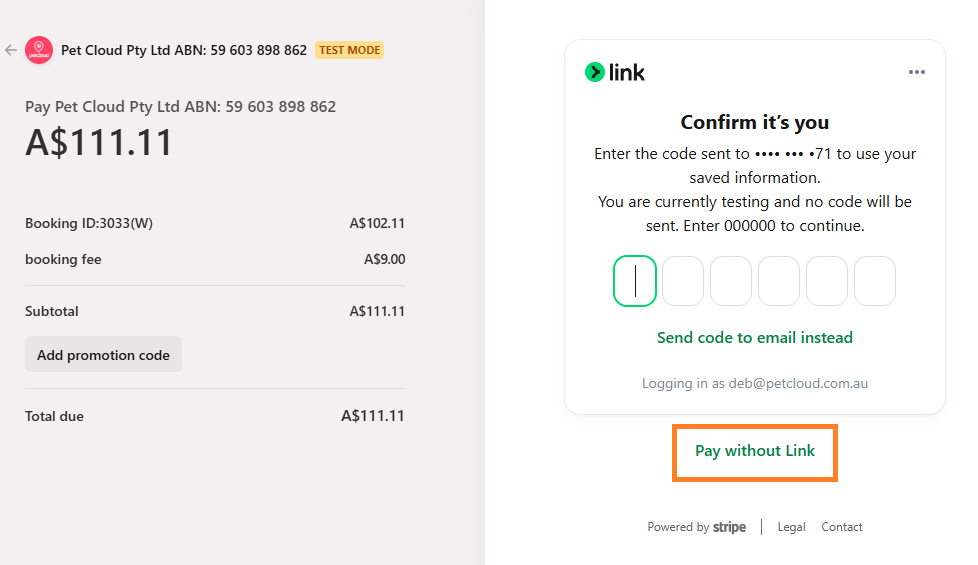 If you have made a once off booking for house sitting or pet boarding months in advance, and don't wish to pay the full amount up front right now - you are able to select "Pay without link".